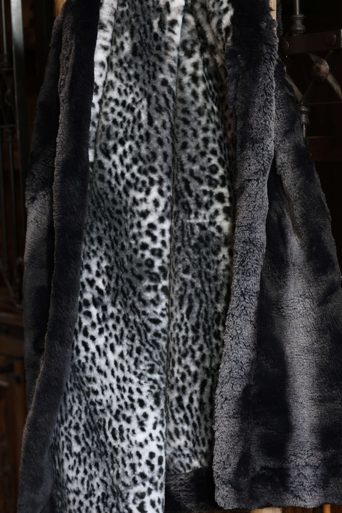 A mysterious black cat that lurks in areas outside of its usual hunting grounds- large in size, imposing in its appearance, alluring because of its mysterious presence.... It's the Phantom Cat. This one is for the heavyweight lovers, those who like to melt underneath its temperature-regulating weight, escape into its plushness, and drool over the silky softness. Black Savanna Minky is Vienna Minky-based, with an array of cheetah spots scattered over a silver and black canvas, complemented perfectly by Black Arctic Chinchilla Minky in a black and silver pinstripe pattern. For the one's that like to keep it spicy but comfy...MEOW...it's calling your name!