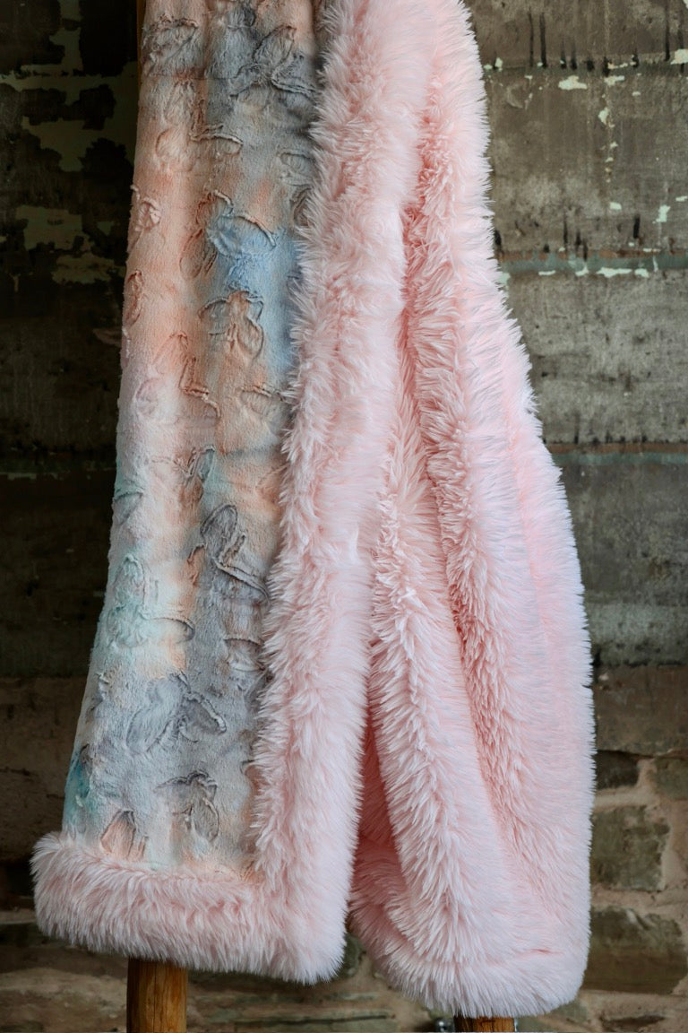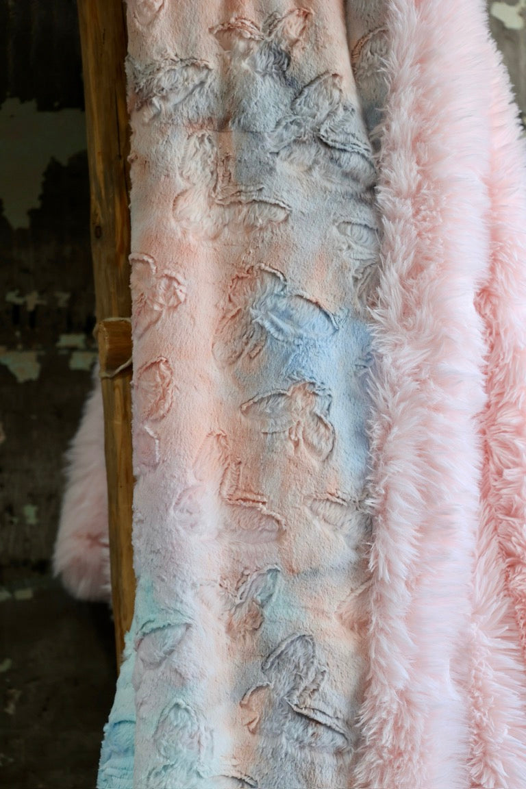 Meet The Blush Butterfly Blanket: A double-sided minky blanket featuring Sugar Swirl Butterflies on one side and rich Blush Dreamy Fur on the other. Indulge in the ultimate embrace with our luxurious, handmade Minky blanket, crafted with care in the USA for unmatched softness and plushness, offering an unparalleled cozy experience.