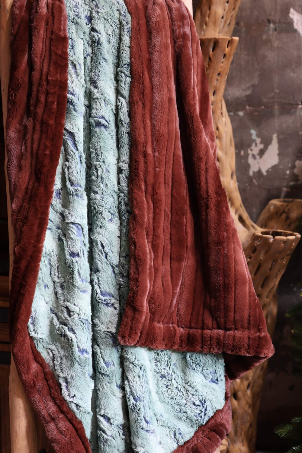 Meet The Cabin Hollow Blanket: Double-sided minky blanket with Artichoke Wild Rabbit Hide on one side and rich Autumn Vienna on the other. Indulge in the ultimate embrace with our luxurious, handmade Minky blanket, crafted with care in the USA to offer unmatched softness and plushness for an unparalleled cozy experience.