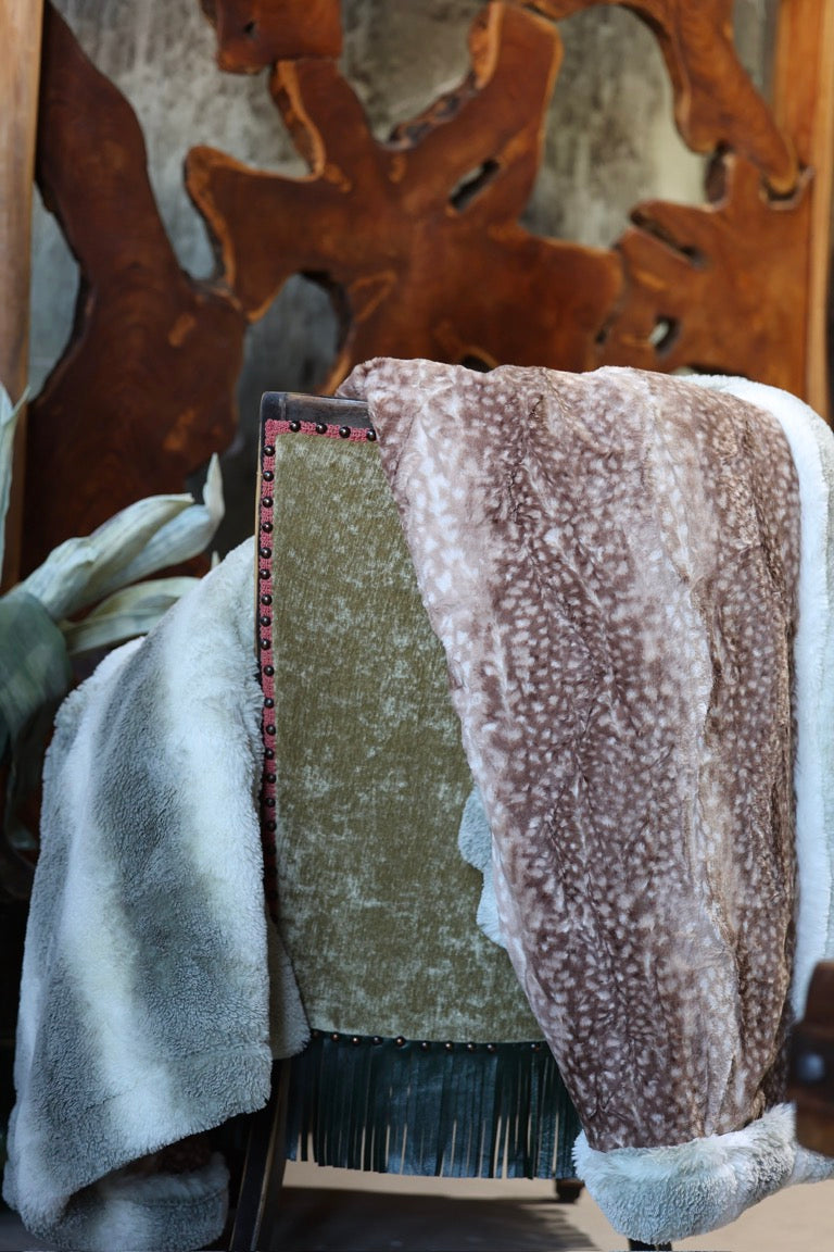 Meet The Cappuccino Grove Blanket: A double-sided minky blanket featuring Cappuccino Fawn on one side and rich Ivy Arctic Chinchilla on the other. Indulge in the ultimate embrace with our luxurious, handmade Minky blanket, crafted with care in the USA for unmatched softness and plushness, offering an unparalleled cozy experience.