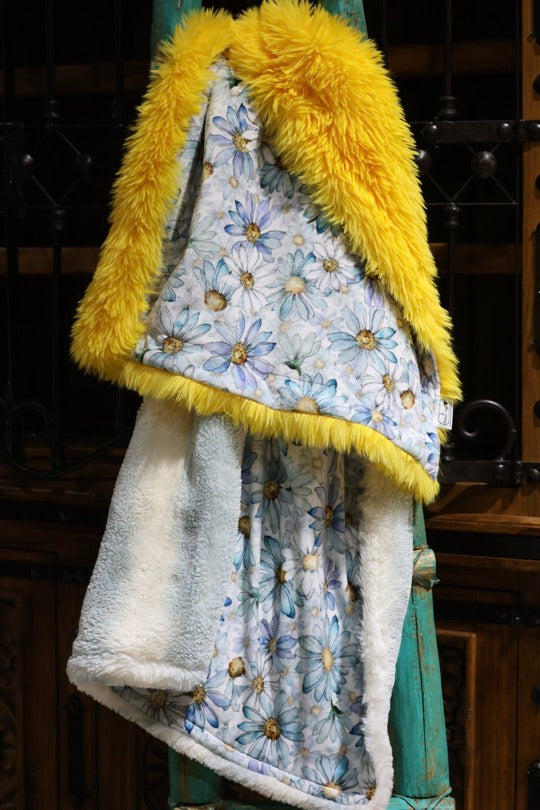 Meet The Daisy Baby Blanket: A double-sided minky blanket featuring Daisys on one side and rich Yellow Dreamy Fur or Raindrop Arctic Chinchilla on the other. Indulge in the ultimate embrace with our luxurious, handmade Minky blanket, crafted with care in the USA for unmatched softness and plushness, offering an unparalleled cozy experience.