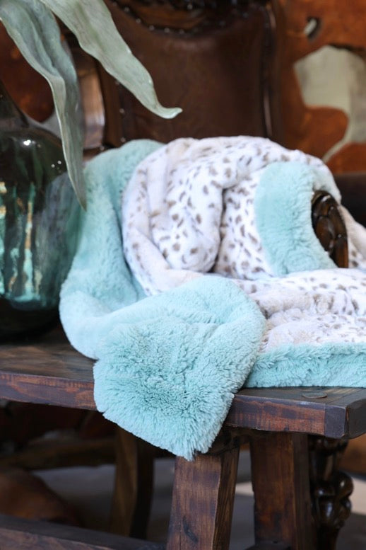 Meet The Dewdrop Wild Blanket: A double-sided minky blanket featuring Taupe Wild Lynx on one side and rich Dewdrop Lush on the other. Indulge in the ultimate embrace with our luxurious, handmade Minky blanket, crafted with care in the USA for unmatched softness and plushness, offering an unparalleled cozy experience.