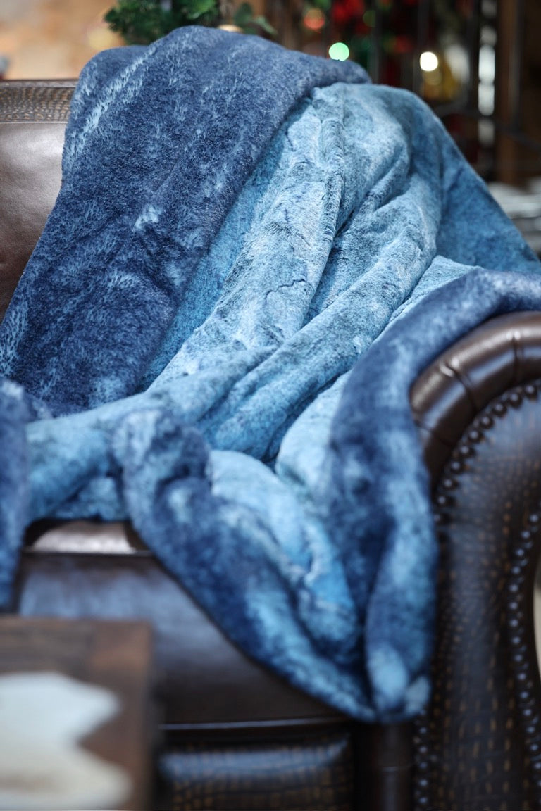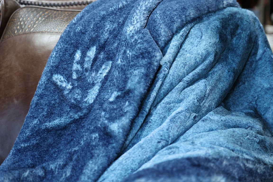 Meet The Midnight Falls Blanket: A double-sided minky blanket featuring Heather Waterfall Hide on one side and rich Nightfall Arctic Fox on the other. Indulge in the ultimate embrace with our luxurious, handmade Minky blanket, crafted with care in the USA for unmatched softness and plushness, offering an unparalleled cozy experience.
