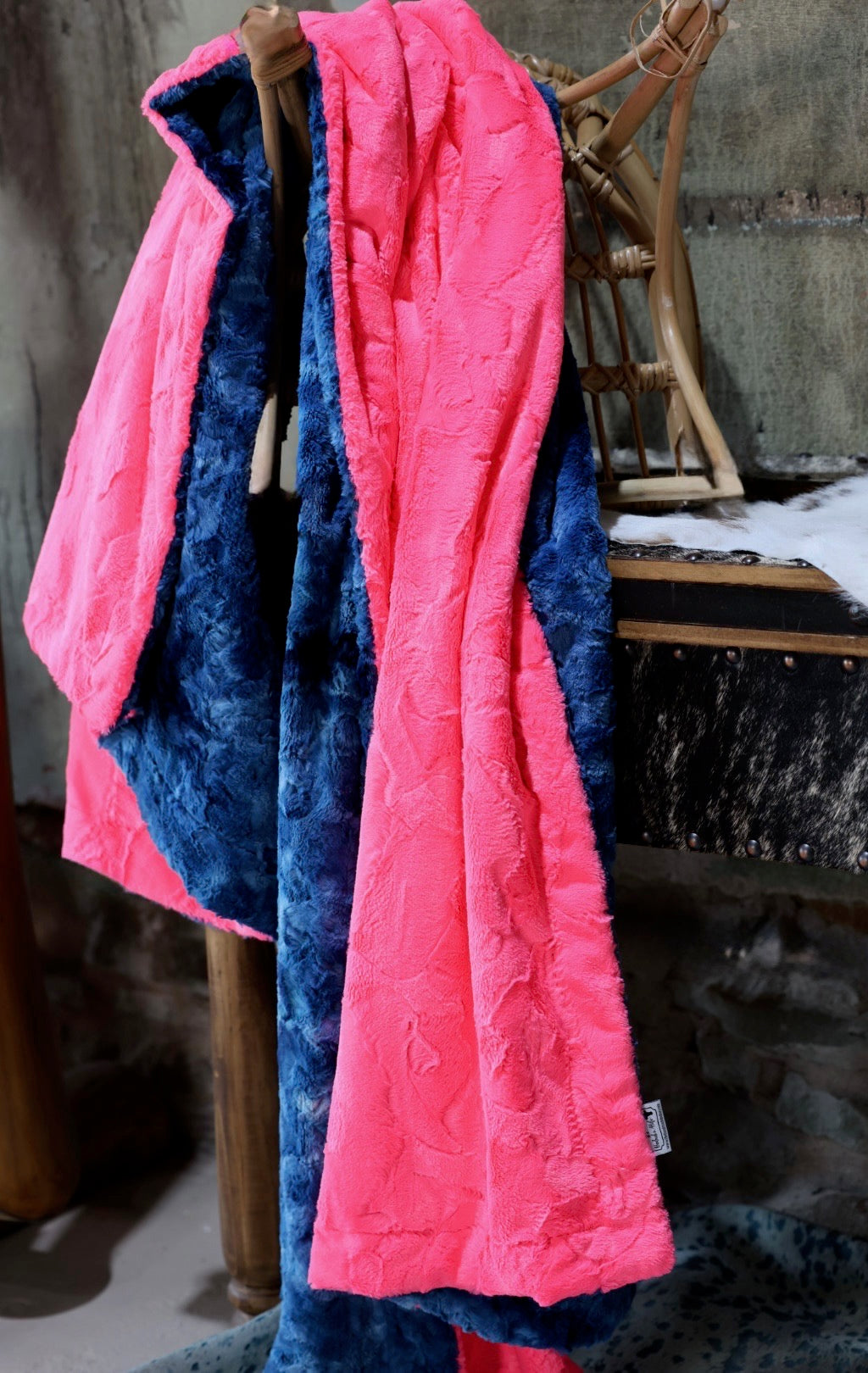 Meet The Ocean Diva Blanket: A double-sided minky blanket featuring Pacific Galaxy Hide on one side and rich Diva Hide on the other. Indulge in the ultimate embrace with our luxurious, handmade Minky blanket, crafted with care in the USA for unmatched softness and plushness, offering an unparalleled cozy experience.