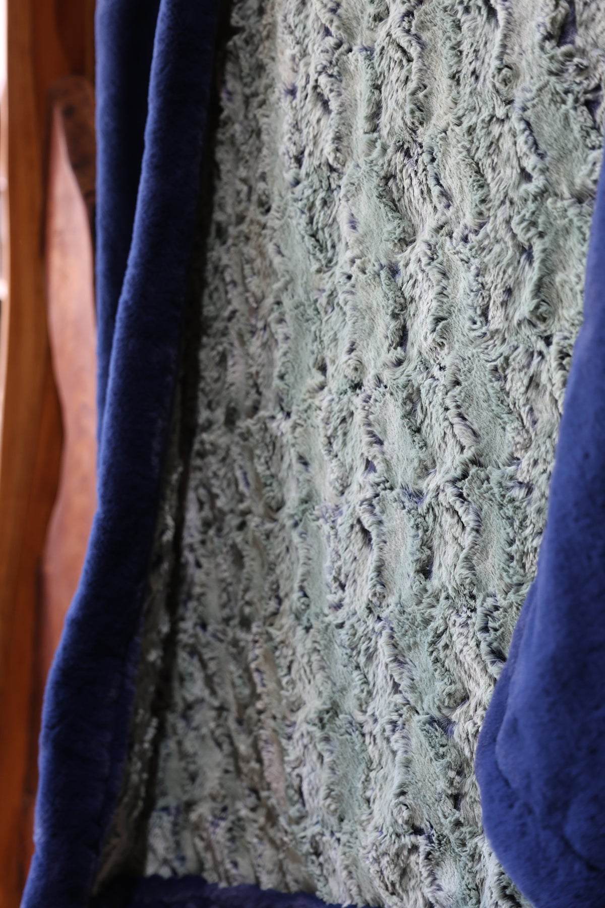 Meet The Twilight Forest Blanket: A double-sided minky blanket featuring Artichoke Wild Rabbit on one side and rich Navy Encore on the other. Indulge in the ultimate embrace with our luxurious, handmade Minky blanket, crafted with care in the USA for unmatched softness and plushness, offering an unparalleled cozy experience.