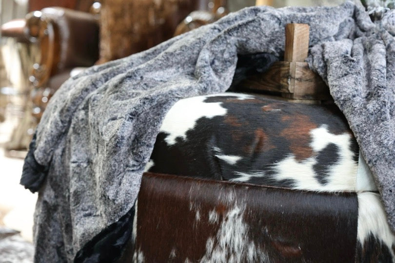 Meet The Willow Eclipse Blanket: A double-sided minky blanket featuring Heather Moonbeam Hide on one side and rich Black Willow  on the other. Indulge in the ultimate embrace with our luxurious, handmade Minky blanket, crafted with care in the USA for unmatched softness and plushness, offering an unparalleled cozy experience.