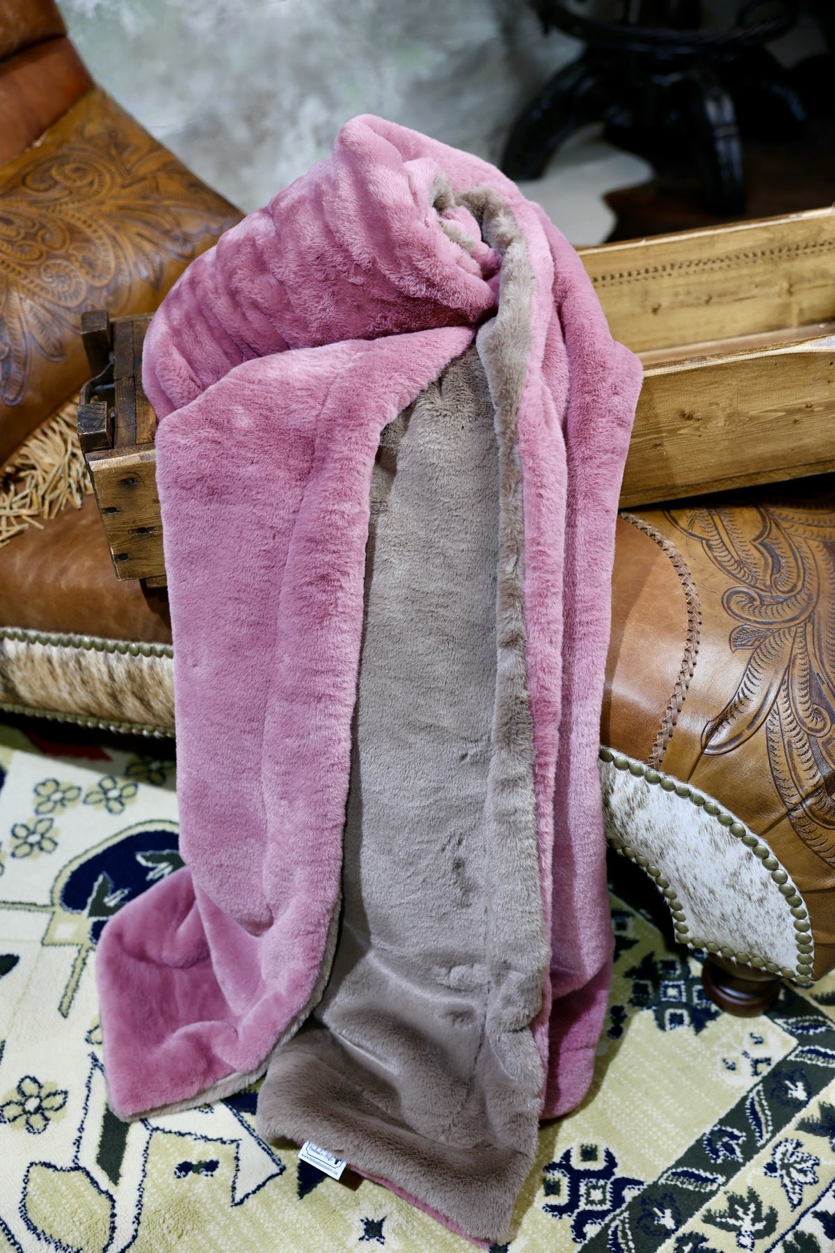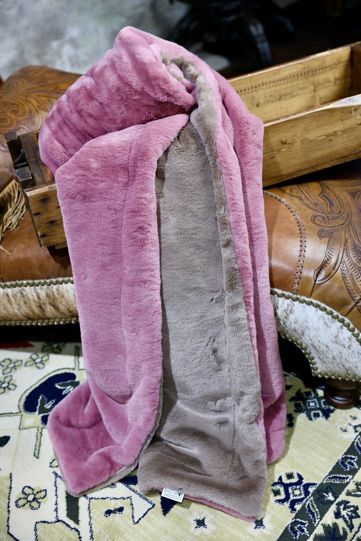 Meet The Desert Rose Blush Glow Blanket: A double-sided minky blanket featuring Truffle Encore on one side and rich Desert Rose Encore on the other. Indulge in the ultimate embrace with our luxurious, handmade Minky blanket, crafted with care in the USA to offer unmatched softness and plushness for an unparalleled cozy experience.