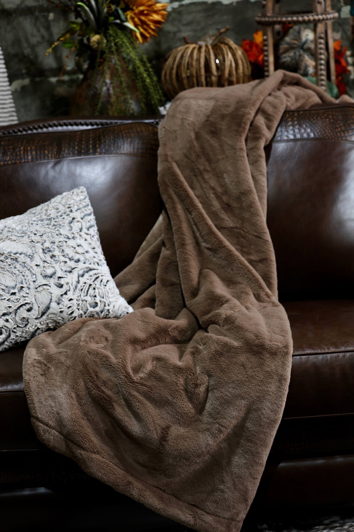 Meet The Encore at Sundown Blanket: A double-sided minky blanket featuring Mocha Baby Calf Hide on one side and rich Truffle Encore on the other. Indulge in the ultimate embrace with our luxurious, handmade Minky blanket, crafted with care in the USA to offer unmatched softness and plushness for an unparalleled cozy experience.