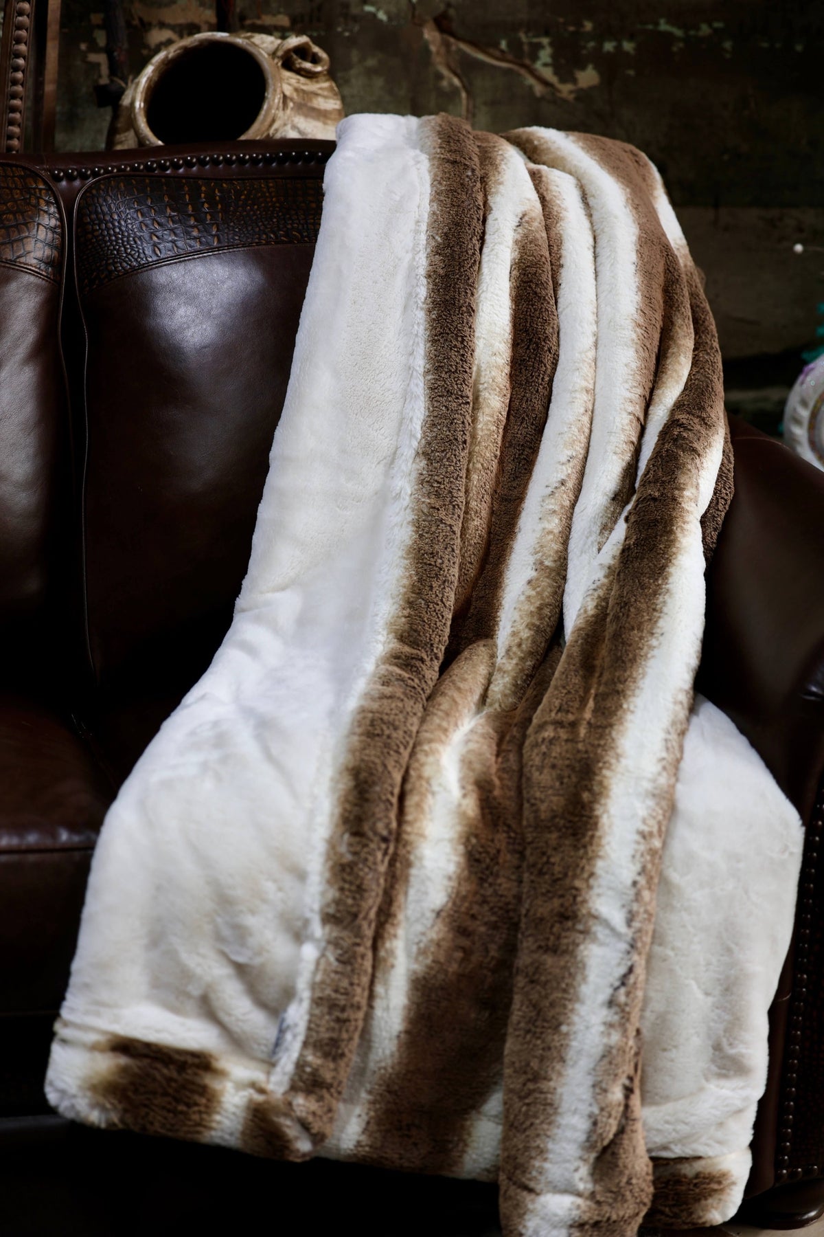 Meet The Frosted Cedar Trail Blanket: A double-sided minky blanket featuring Natural Bunny on one side and rich Rustic Arctic Chinchilla on the other. Indulge in the ultimate embrace with our luxurious, handmade Minky blanket, crafted with care in the USA to offer unmatched softness and plushness for an unparalleled cozy experience.