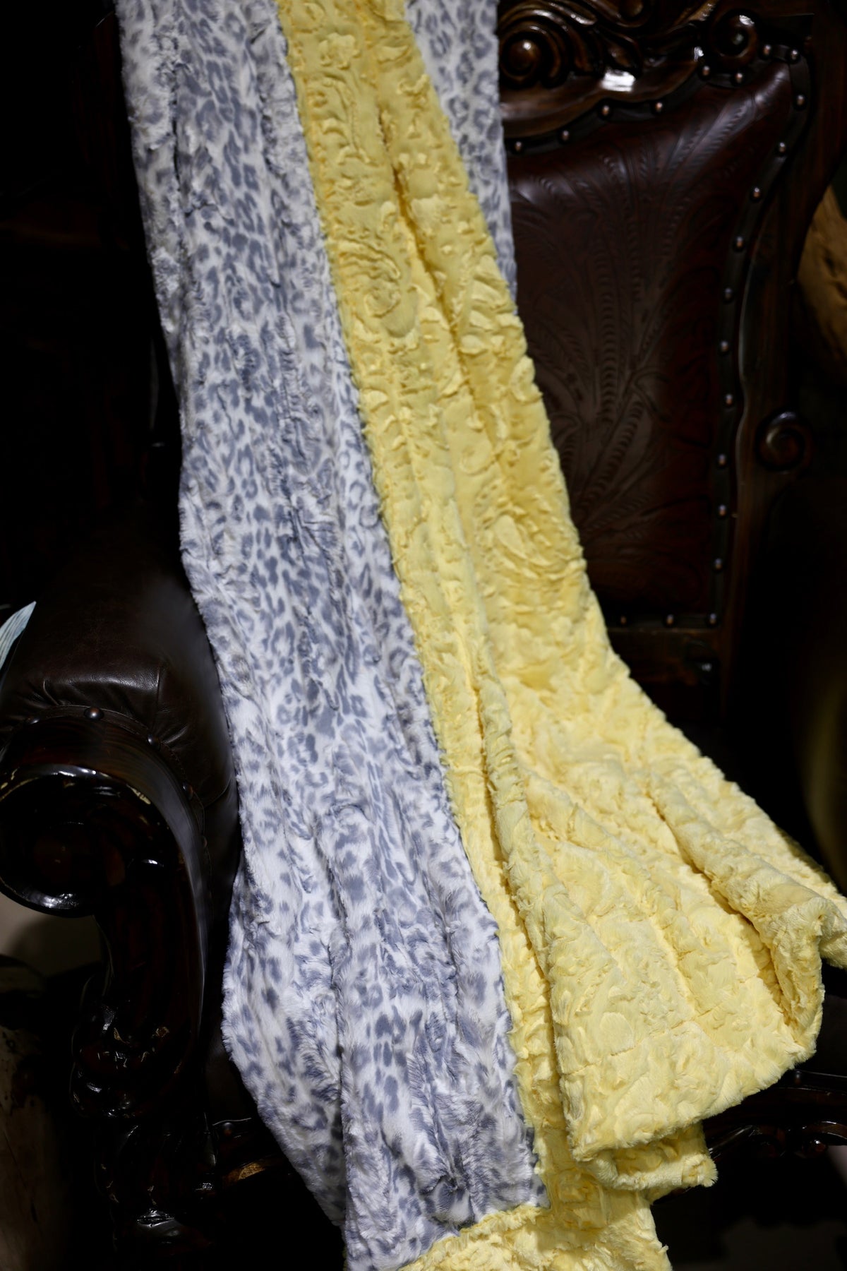 Meet The Lassoed in Gold Blanket: A double-sided minky blanket featuring Vapor Jaguar Hide on one side and rich Gold Buckle Paisley Hide on the other. Indulge in the ultimate embrace with our luxurious, handmade Minky blanket, crafted with care in the USA to offer unmatched softness and plushness for an unparalleled cozy experience.