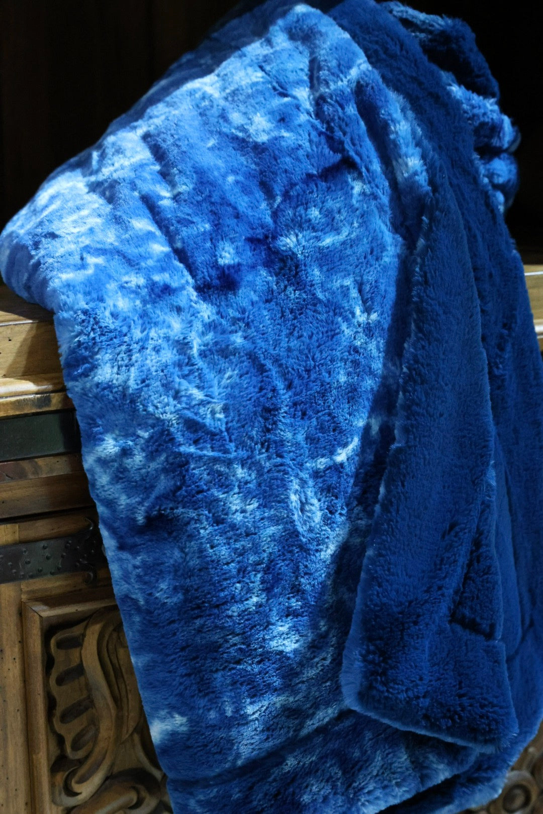 Meet The Ocean Eclipse Blanket: A double sided minky blanket featuring Pacific Fusion Bunny on one side and rich Dark Sea Bunny  on the other. Indulge in the ultimate embrace with our luxurious, handmade Minky blanket, crafted with care in the USA for unmatched softness and plushness, offering an unparalleled cozy experience.