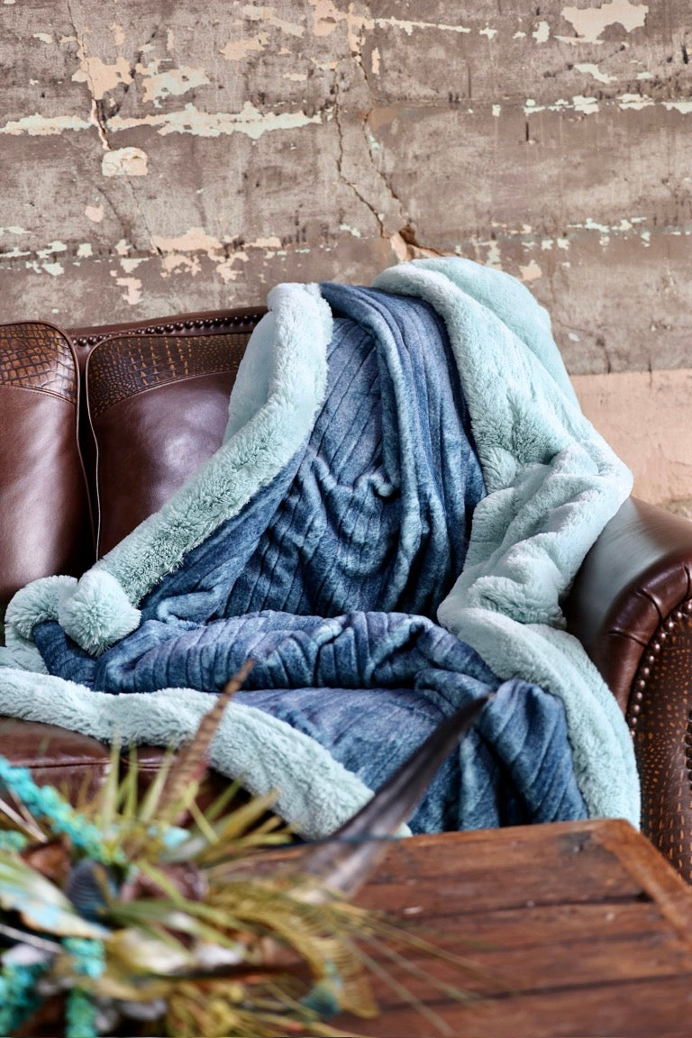 Meet The Rain & Shine Blanket: A double-sided minky blanket featuring Raindrop Glazed Vienna on one side and rich Dewdrop Lush on the other. Indulge in the ultimate embrace with our luxurious, handmade Minky blanket, crafted with care in the USA for unmatched softness and plushness, offering an unparalleled cozy experience.