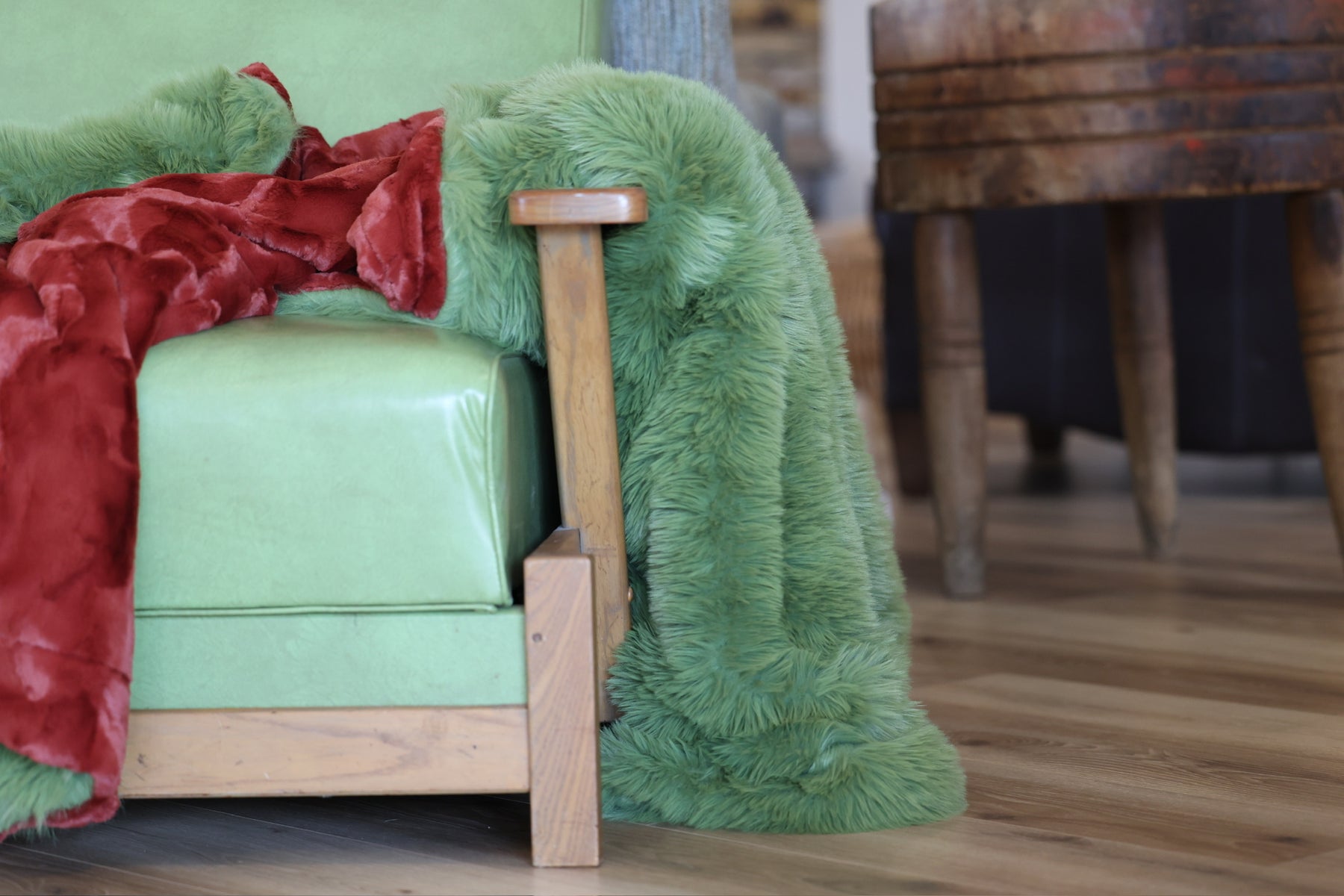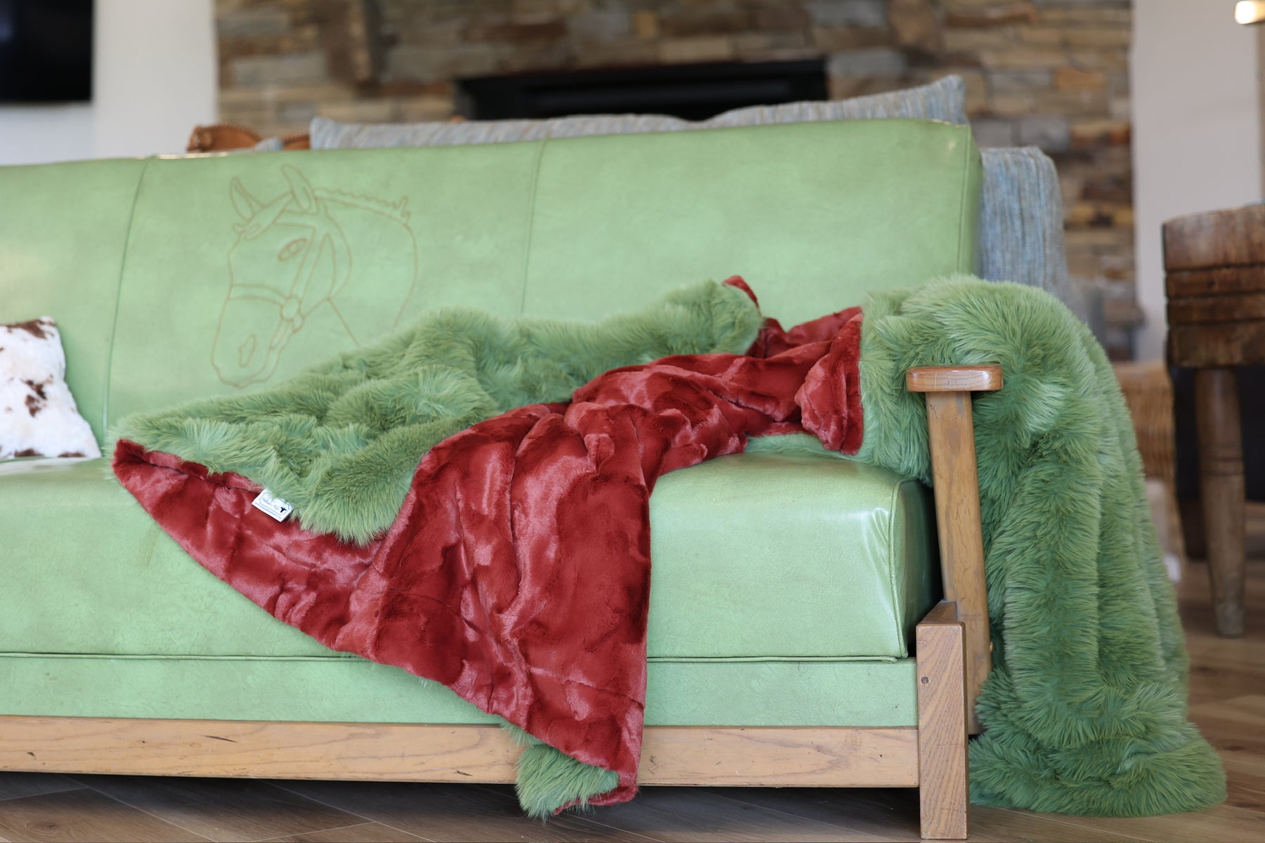 Meet The Saffron in the Wind Blanket: A double-sided minky blanket featuring Spice Hide on one side and rich Olive Dreamy Fur on the other. Indulge in the ultimate embrace with our luxurious, handmade Minky blanket, crafted with care in the USA to offer unmatched softness and plushness for an unparalleled cozy experience.