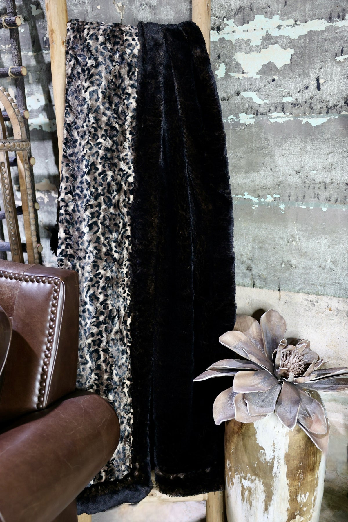 Meet The Smoky Bobcat Night Blanket: A double-sided minky blanket featuring Taupe Bobcat Hide on one side and rich Black Coffee Arctic Fox on the other. Indulge in the ultimate embrace with our luxurious, handmade Minky blanket, crafted with care in the USA to offer unmatched softness and plushness for an unparalleled cozy experience.