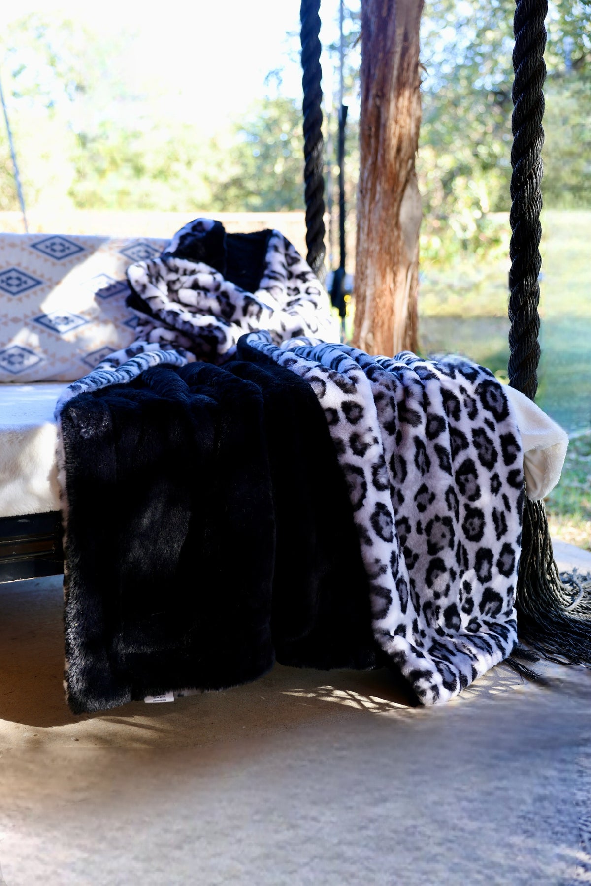 Meet The Steel in the Night Blanket: A double-sided minky blanket featuring Alloy Wild Jaguar on one side and rich Black Encore on the other. Indulge in the ultimate embrace with our luxurious, handmade Minky blanket, crafted with care in the USA to offer unmatched softness and plushness for an unparalleled cozy experience.