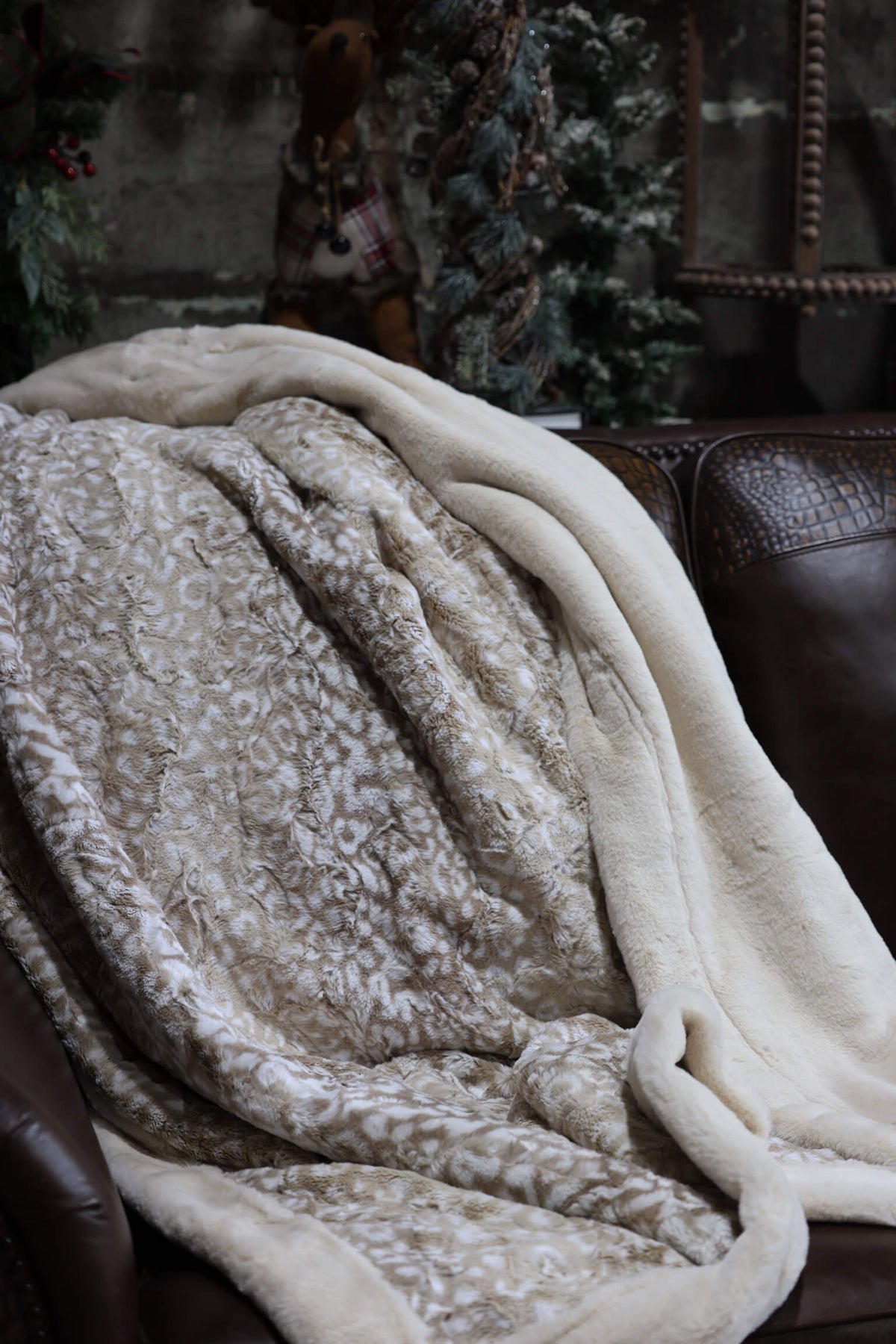 Meet Biscotti Belle Blanket: Double-sided with Biscotti Ocelot Hide on one side and rich Beige Encore on the other. Indulge in the ultimate embrace with our luxurious, handmade Minky blanket, crafted with care in the USA to offer unmatched softness and plushness for an unparalleled cozy experience.
