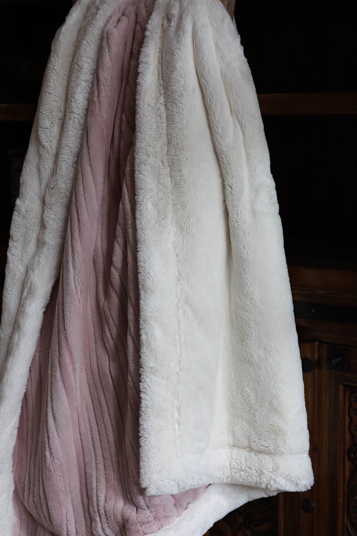 Meet The Blushing Snow Petal Blanket: A double-sided minky blanket featuring Rosewater Vienna on one side and rich Natural Arctic Rabbit on the other. Indulge in the ultimate embrace with our luxurious, handmade Minky blanket, crafted with care in the USA to offer unmatched softness and plushness for an unparalleled cozy experience.