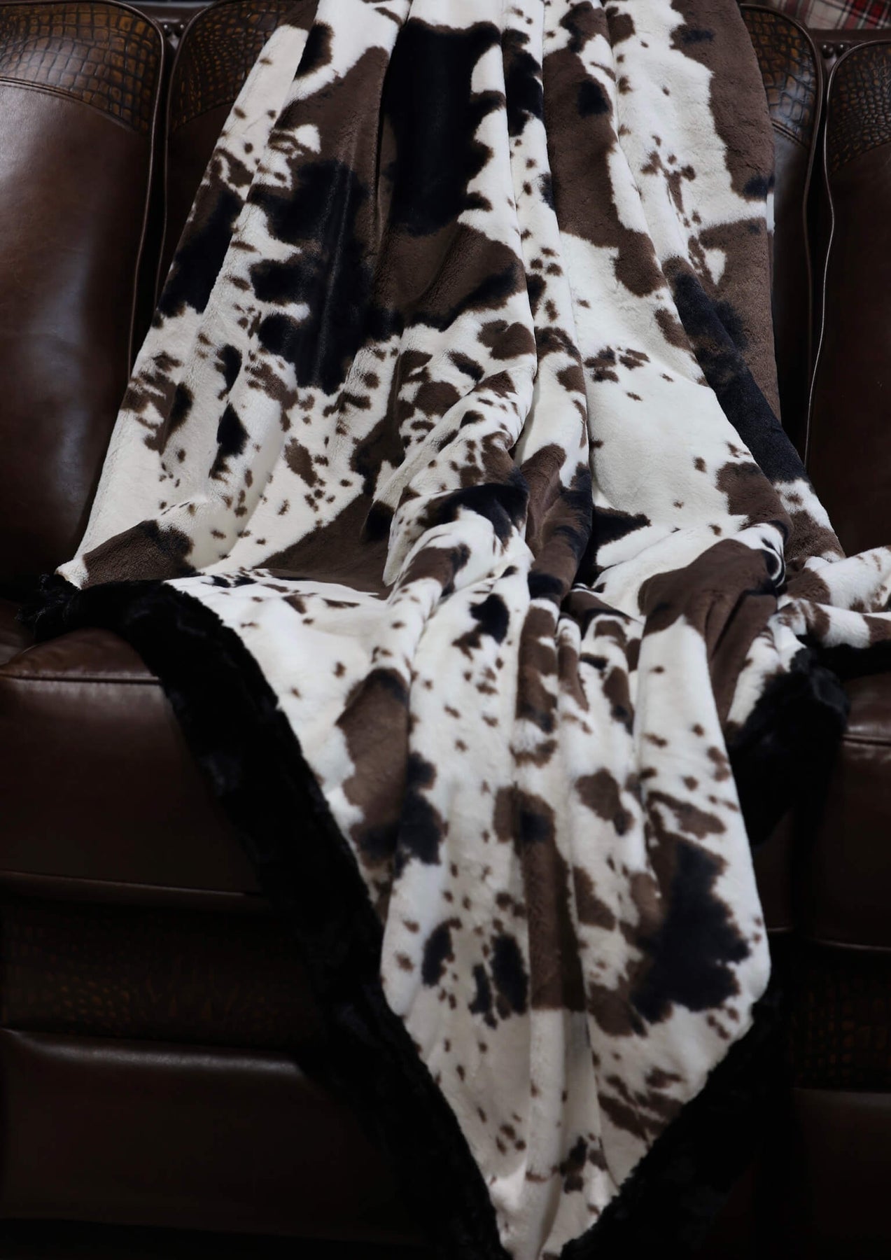 Meet The Buckaroo Blanket: Double-sided with Mudpie Pony Minky on one side and rich Black Hide Minky on the other. Indulge in the ultimate embrace with our luxurious, handmade Minky blanket, crafted with care in the USA to offer unmatched softness and plushness for an unparalleled cozy experience.