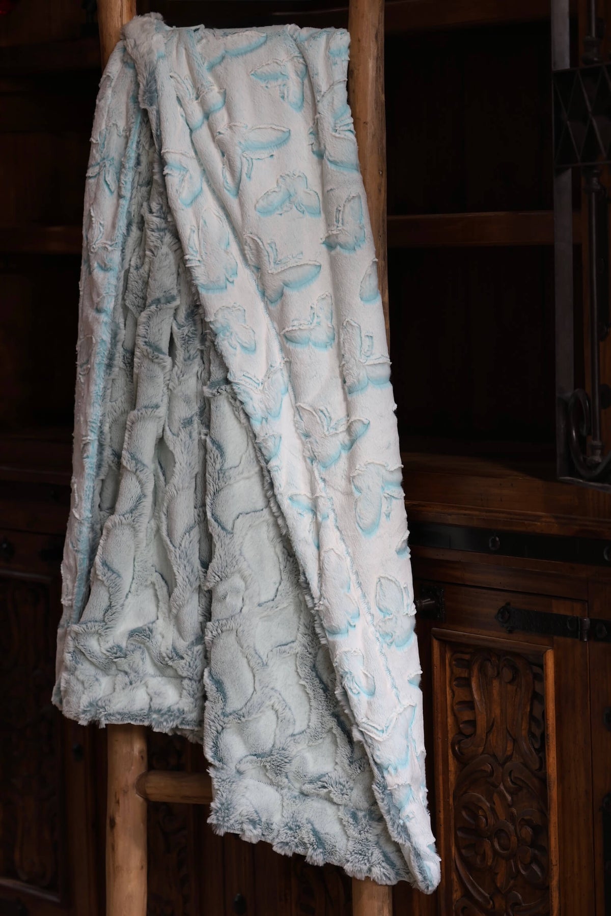 Meet The Starlit Wings Blanket: Double-sided with Waterlily Bailey Bunny on one side and rich Saltwater Butterfly Hide on the other. Indulge in the ultimate embrace with our luxurious, handmade Minky blanket, crafted with care in the USA to offer unmatched softness and plushness for an unparalleled cozy experience.