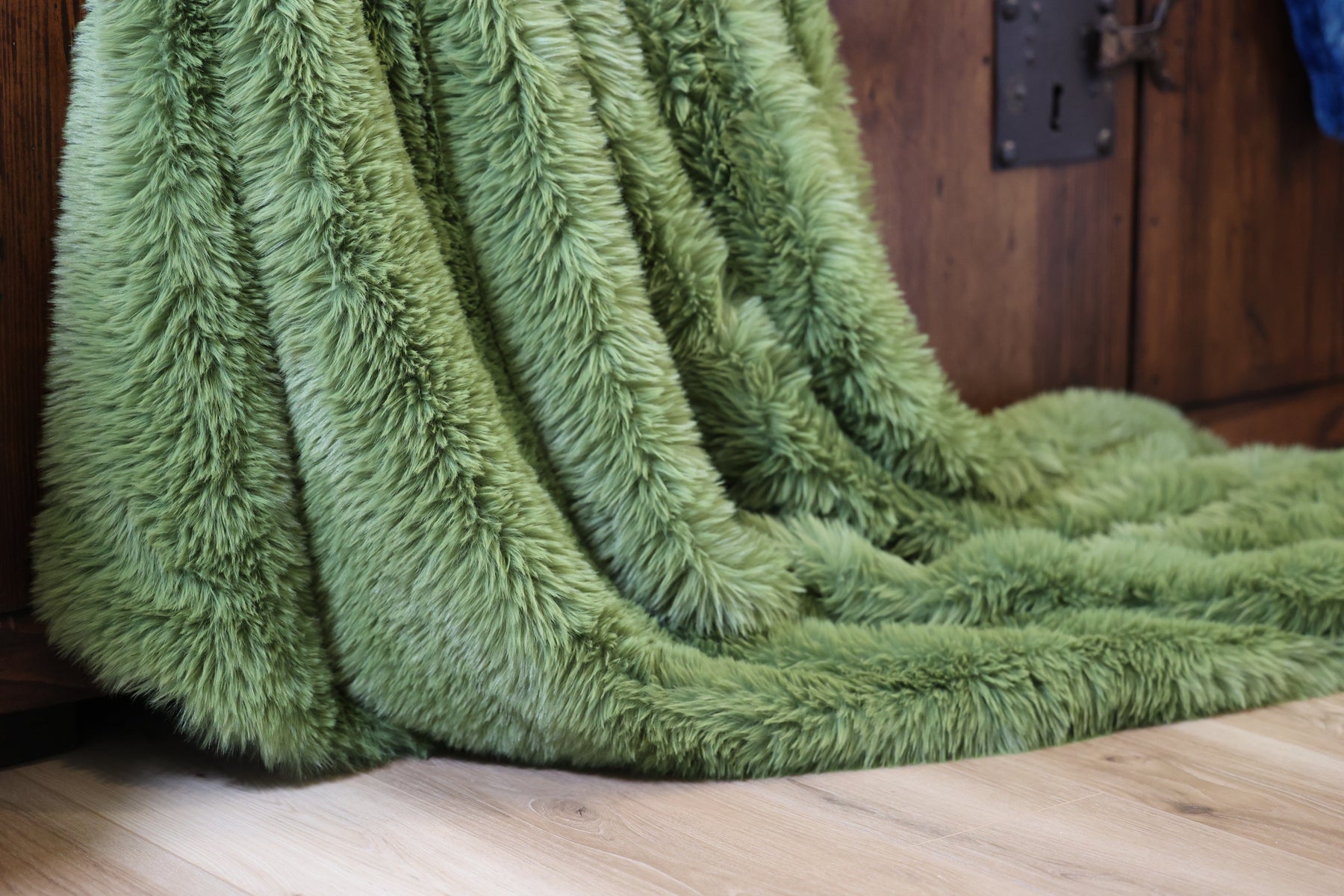 Meet The Green Dream Blanket: A double-sided minky blanket featuring Olive Dreamy Fur on both sides. Indulge in the ultimate embrace with our luxurious, handmade Minky blanket, crafted with care in the USA to offer unmatched softness and plushness for an unparalleled cozy experience.
