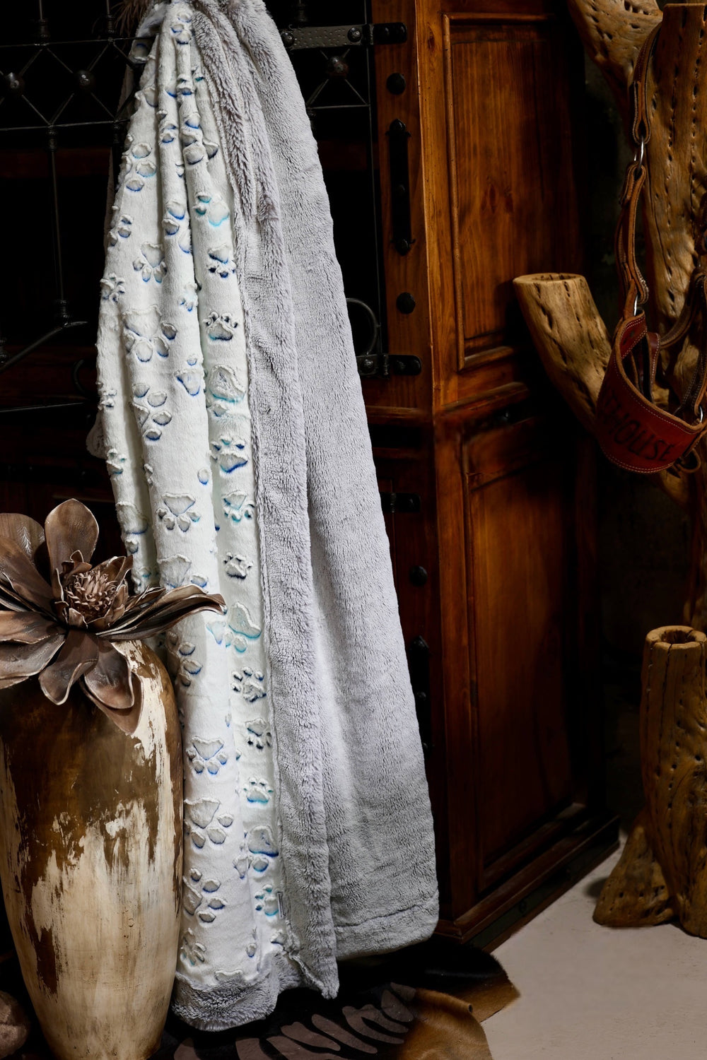 Meet The Harbor Pup Blanket: A double-sided minky blanket featuring Nautical Paws Hide on one side and rich Dove Snow Bunny on the other. Indulge in the ultimate embrace with our luxurious, handmade Minky blanket, crafted with care in the USA to offer unmatched softness and plushness for an unparalleled cozy experience.