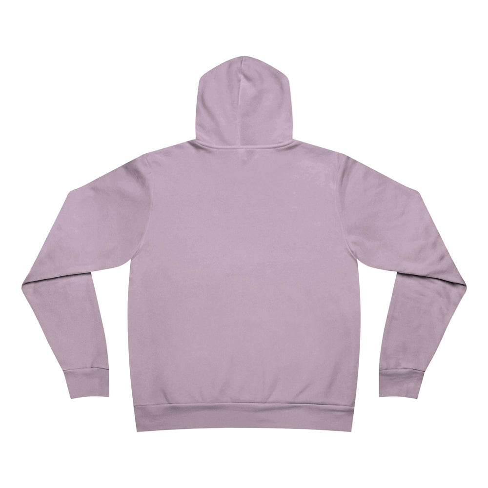 The unisex sponge fleece pullover hoodie is a blend of Airlume cotton and polyester. The percentages vary according to color. A pouch-style pocket spreads across the lower half of the garment’s front. The hood can be tightened with a white drawcord. Both cuffs and waistband have ribbing for extra grip.