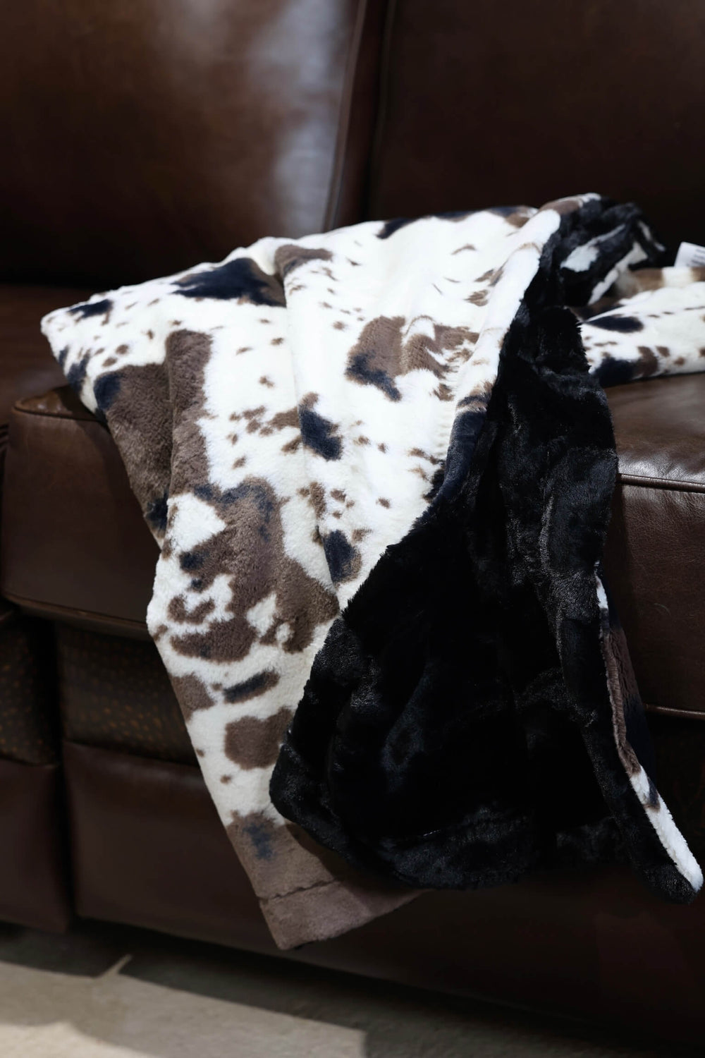 Meet The Buckaroo Blanket: Double-sided with Mudpie Pony Minky on one side and rich Black Hide Minky on the other. Indulge in the ultimate embrace with our luxurious, handmade Minky blanket, crafted with care in the USA to offer unmatched softness and plushness for an unparalleled cozy experience.