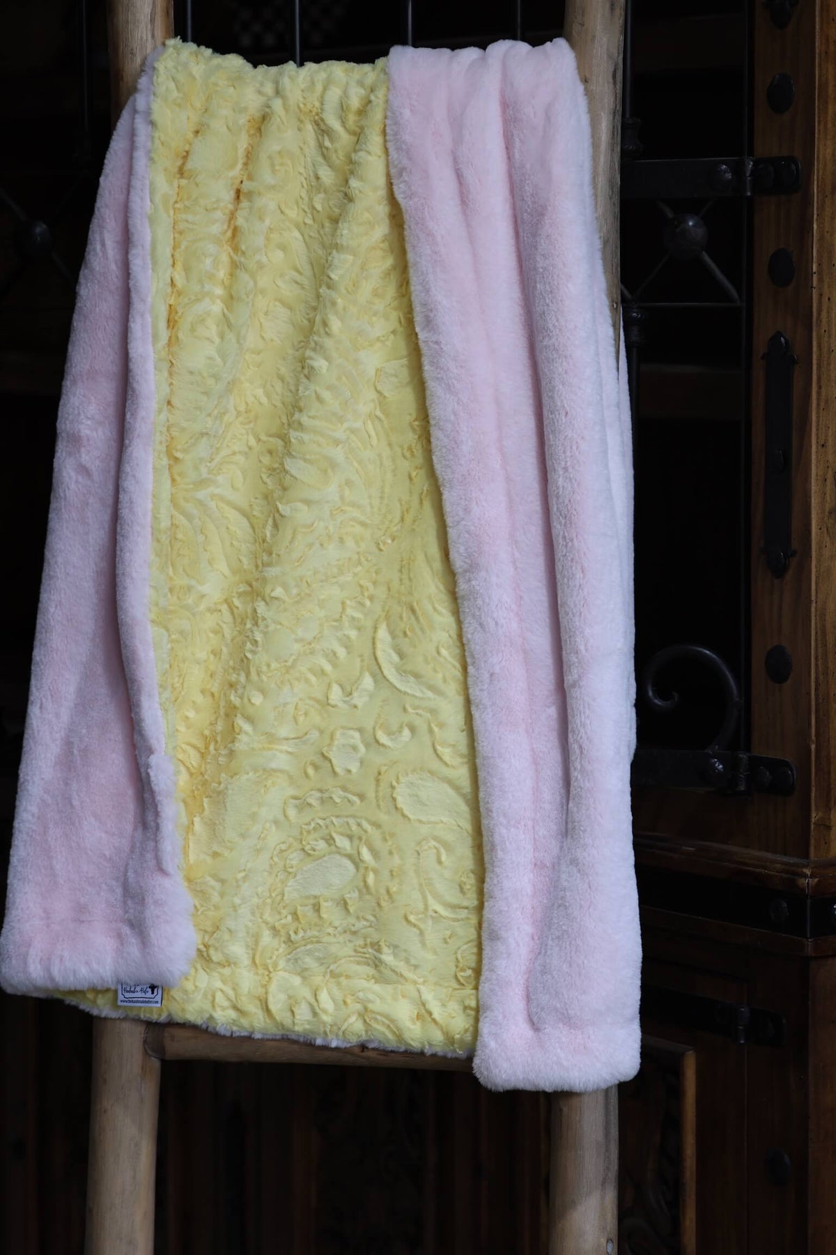 Meet The Roseaurum Blanket: A double-sided minky blanket featuring Gold Buckle Paisley Hide on one side and rich Ice Pink Encore on the other. Indulge in the ultimate embrace with our luxurious, handmade Minky blanket, crafted with care in the USA to offer unmatched softness and plushness for an unparalleled cozy experience.