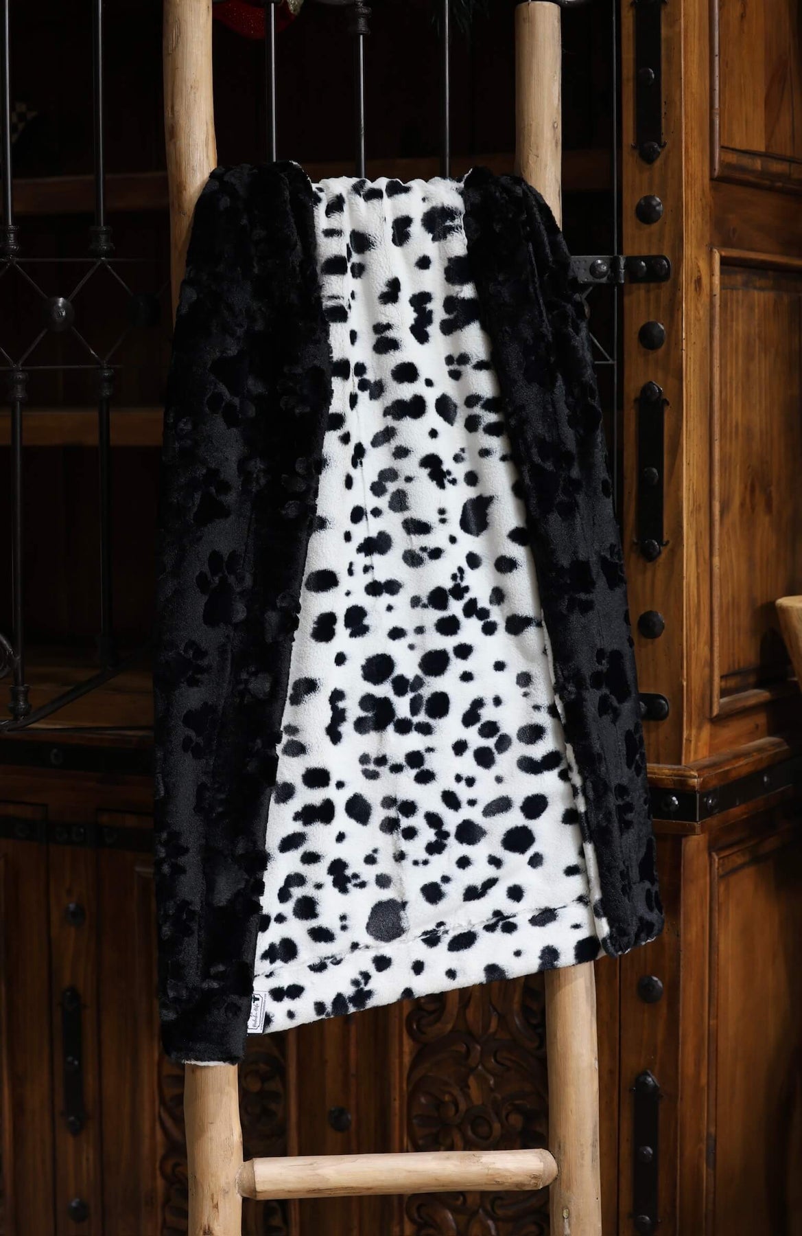 Meet Blanket Name: A double-sided minky blanket featuring Dalmatian Hide on one side and rich Black Paws Hide on the other. Indulge in the ultimate embrace with our luxurious, handmade Minky blanket, crafted with care in the USA to offer unmatched softness and plushness for an unparalleled cozy experience.